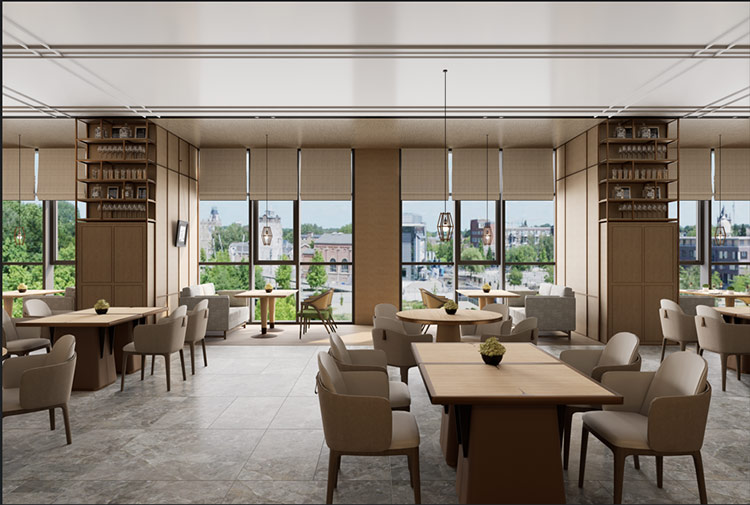 * Ang mga mainit nga neyutral nga mga kolor: mga tono sa caramelized nga nagsagol sa pula nga brown nga adunay moderno, angay alang sa paghimo sa usa ka nostaltik nga komersyal nga palibot.